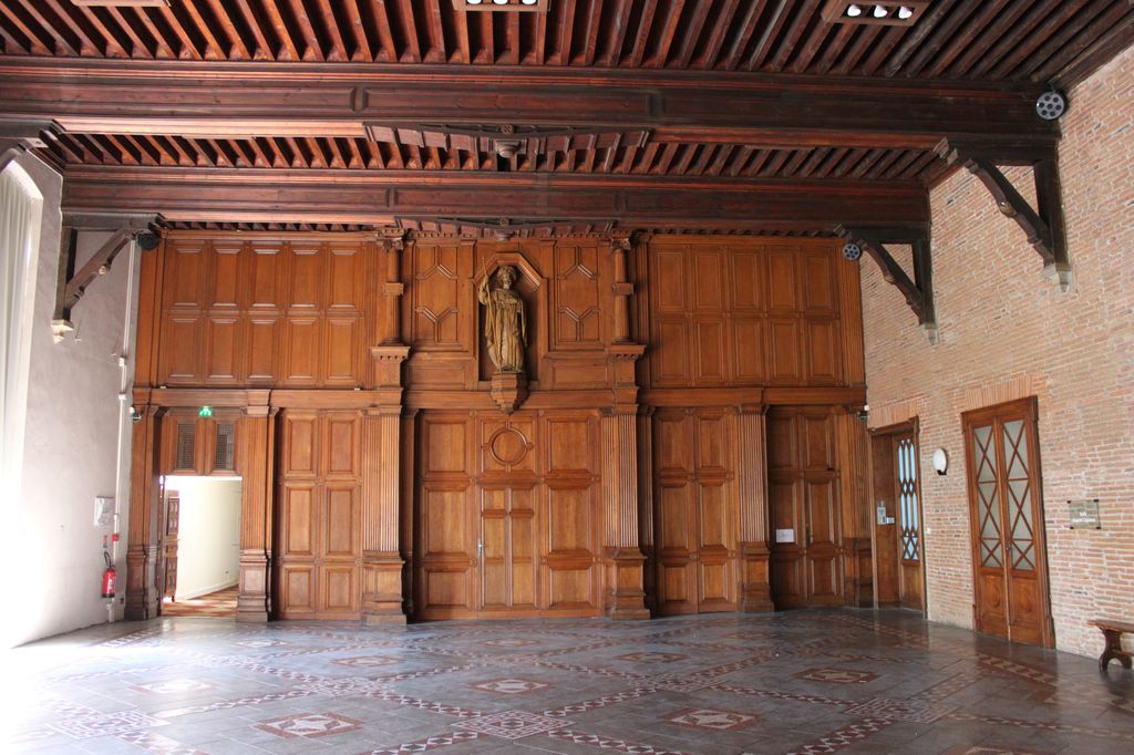 La salle des pèlerins, ou salle des pas perdus, et ses belles boiseries dont la statue de saint Jacques :
