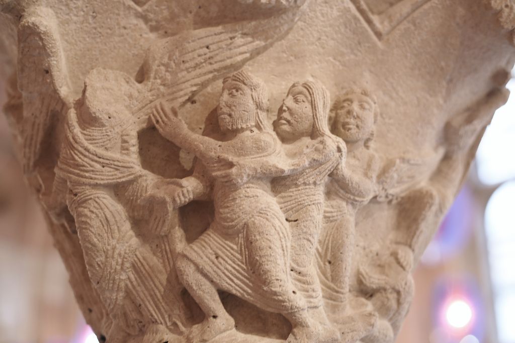 Au Moyen âge la population savait décoder un chapiteau tel que celui-ci. Ces chapiteaux étaient donc les supports d'une communication de l'Eglise au peuple, illustrant les scènes bibliques mieux qu'un sermon en latin, et mieux également qu'un livre que bien peu de contemporains auraient su lire.