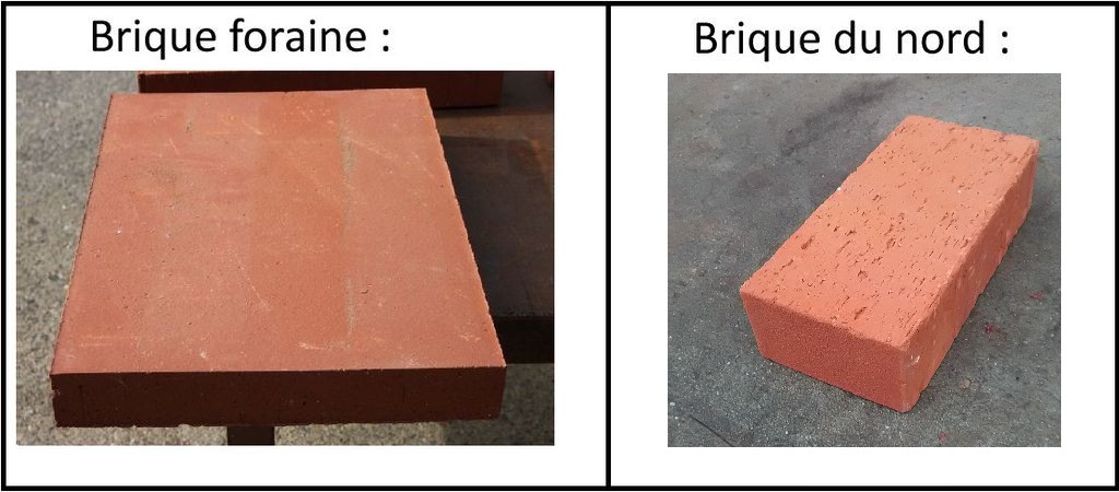 Brique foraine taillée : exemple ici d'un pilastre dont la taille n'a pas été faite (à gauche), comparé à un pilastre terminé (à droite) :